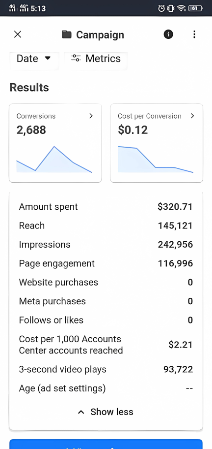 Achieved over 2,600 conversions with an average cost per conversion of just $0.12.