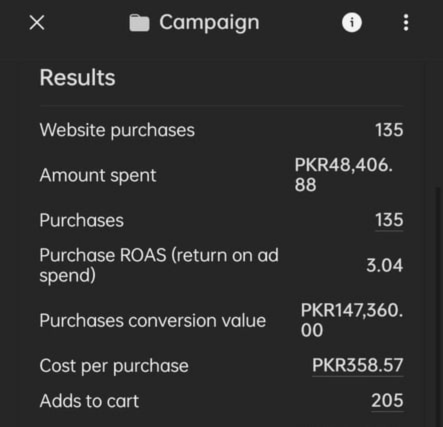Completed 135 website purchases, with a purchase ROAS (Return on Ad Spend) of 3.04, indicating profitable ad spending.